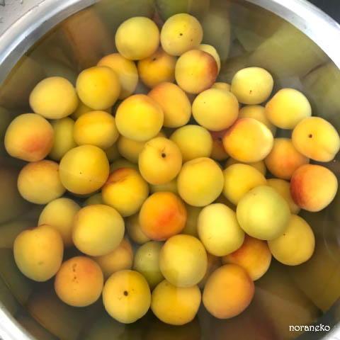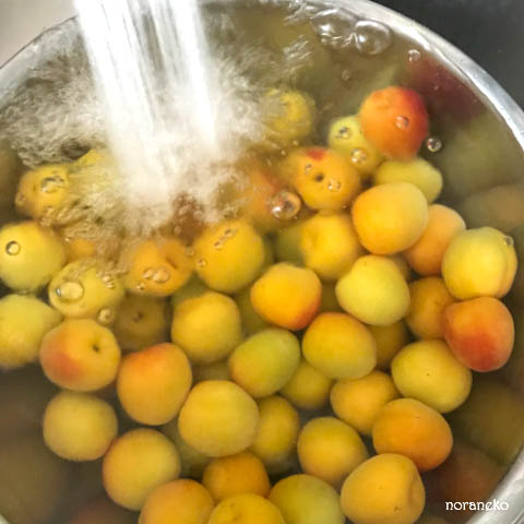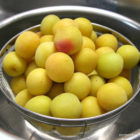 - ボウルに梅を入れ、水を注ぎほこりや付着物を落とす